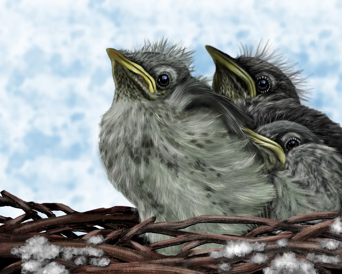 Baby mockingbirds waiting patiently for their mama. Available as a digital download in various sizes.