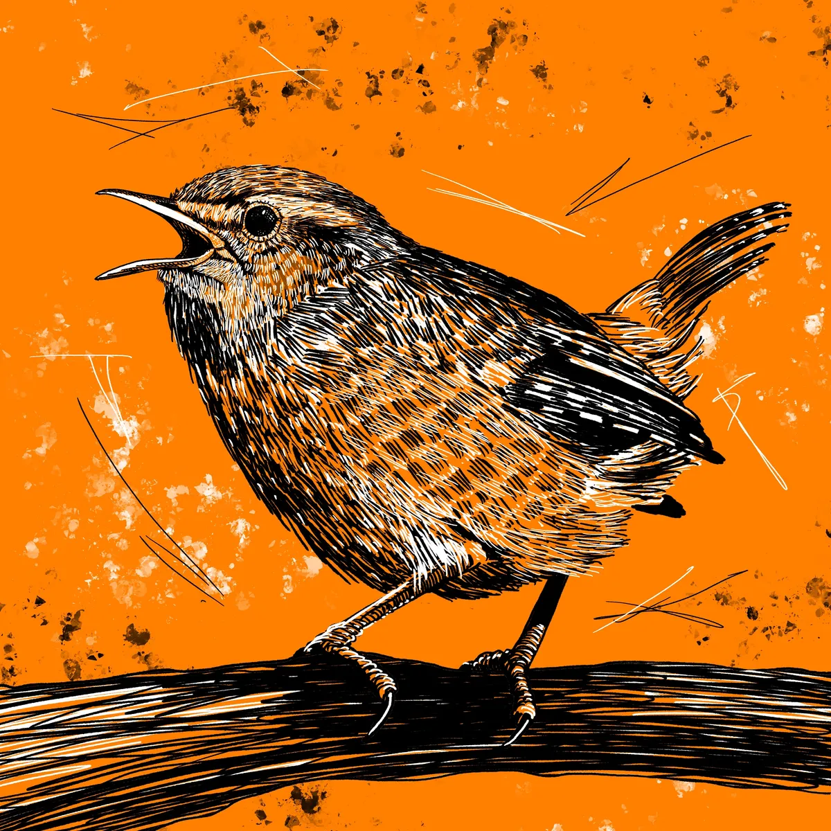 A detailed black and white sketch of a wren standing on a branch against a vibrant yellow background.