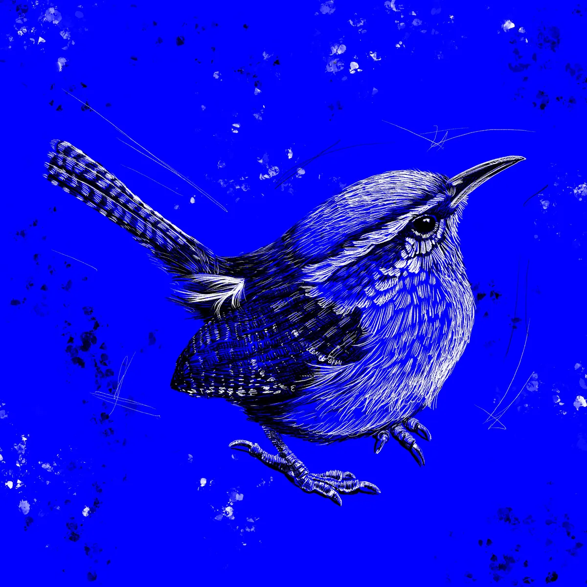 A pen and ink bird with intricate details set against a vibrant blue background. Available as a digital download.